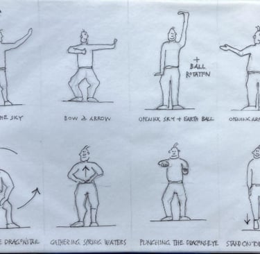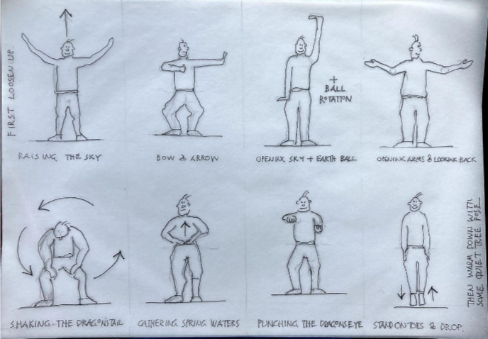 The Eight Brocades of Silk 八段錦: special thanks to George from the Gillespie group who created this lovely drawing that we can make use of as a reminder for home practice during summer holiday. For more details, come to class.